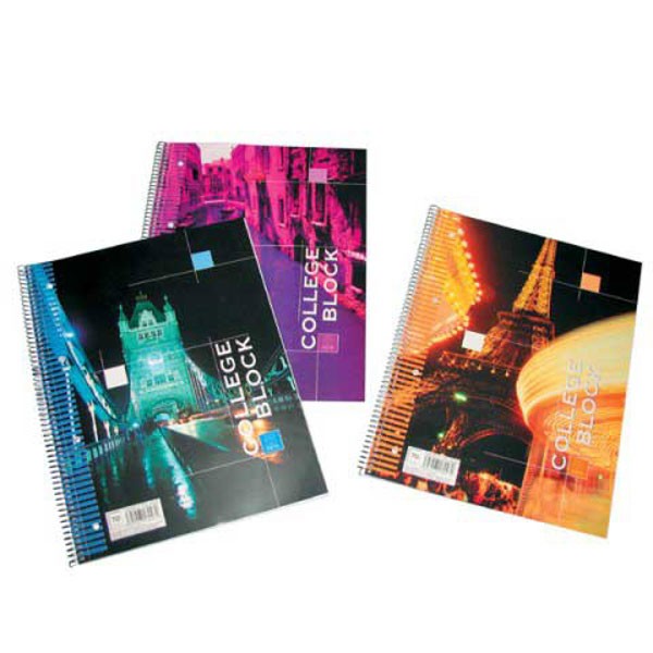 Poznámkové bloky linajkové s kovovou špirálou po dlhšej strane a otvormi na zakladanie do šanónov. Predná strana podľa aktuálnej ponuky.