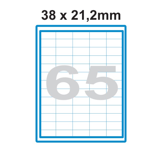 Cenovo výhodné etikety na hárkoch A4 vhodné do laserových a atramentových tlačiarní, ako aj kopírovacích strojov. Rozmer etikety 38×21,2 mm, počet etikiet na hárku 65, balenie 100 hárkov.