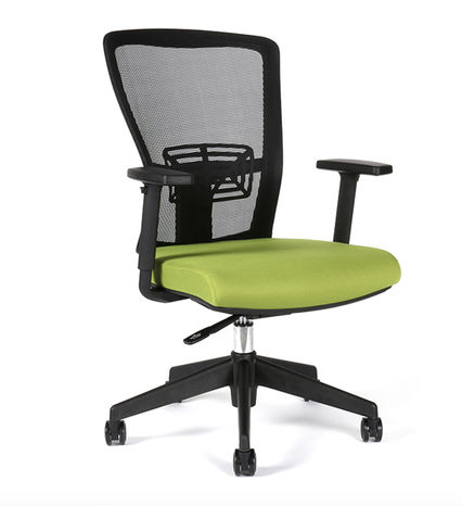 Kancelárska stolička THEMIS BP: univerzálne plastové kolieska, nylonový čierny kríž, automatická mechanika so 4 polohami aretácie, čalúnený sedák v 4 voliteľných farbách, operadlo z čiernej samonosnej sieťoviny, výškovo nastaviteľné podrúčky, výškovo nastaviteľná bedrová opierka.
