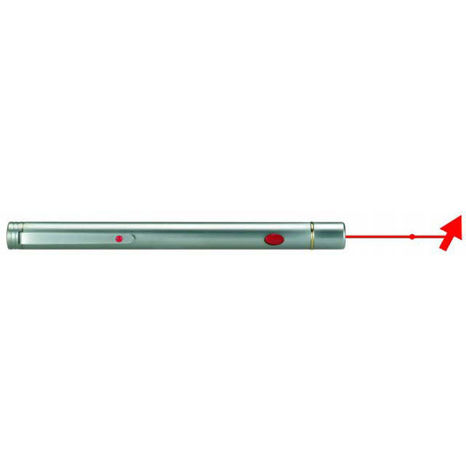 Matnostrieborné kovové prevedenie. Červené tlačidlo. Červený bod sa otočením laserovej hlavy zmení na šípku. Dĺžka 14 cm.