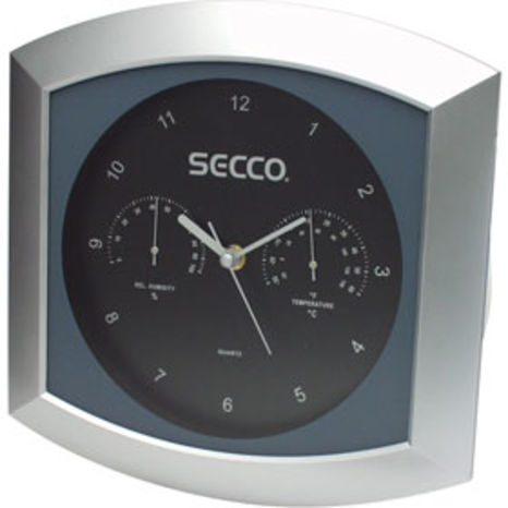 Nástenné hodiny. Napájanie z batérie. Rozmery 280 MM. Puzdro v tvare štvorca. Plastové puzdro Šedá farba puzdra. Ručičkový ciferník. Čierna farba ciferníka. Ciferník s arabskými číslami Barometer Teplomer
