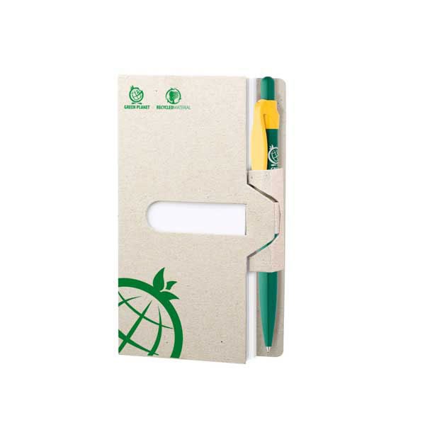 ICO GREEN blok z recyklovaného papiera a s ICO GREEN guľôčkovým perom, vyrobeným z BIOPLASTU, ktorý je 100% biologicky rozložiteľný