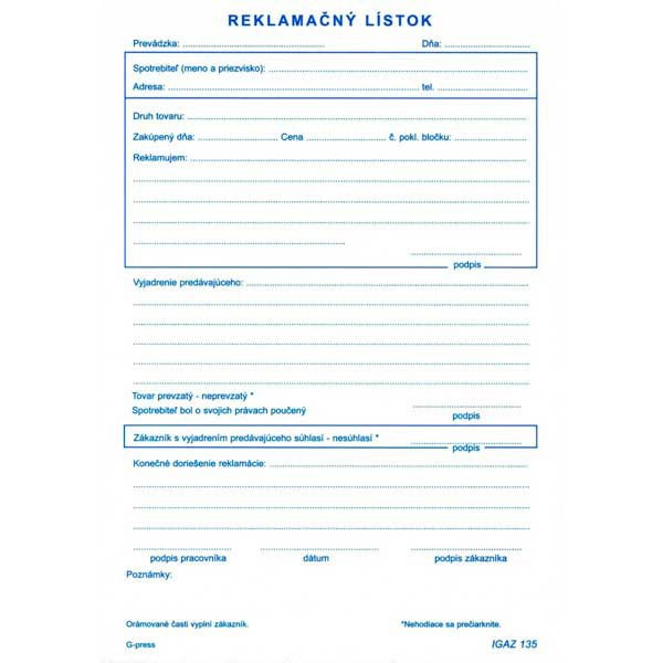 Reklamačný list A5 samo prepisovací