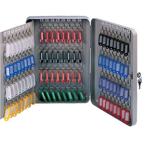 Uzamykateľná kovová skrinka na kľúče. Súčasťou balenia sú farebné menovky a 2 kľúče. Rozmery 280 x 370 x 80 mm.