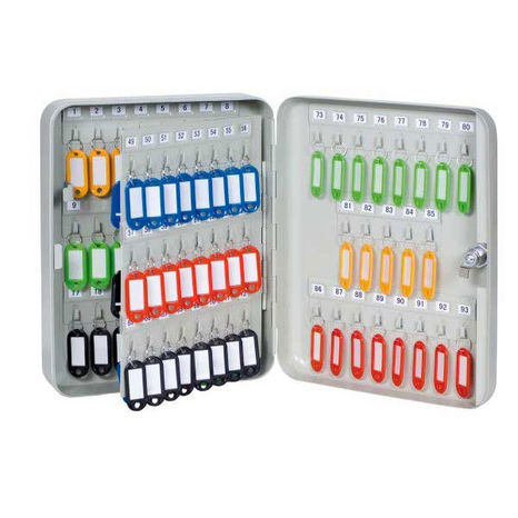 Uzamykateľná kovová skrinka na kľúče. Súčasťou balenia sú farebné menovky a 2 kľúče. Rozmery 240 x 300 x 80 mm.