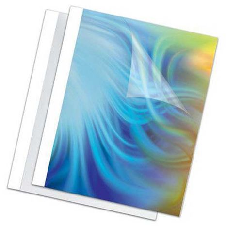 Obal na termoväzbu s kartónovým bielym zadným listom a priehľadným predným PVC listom s naneseným lepidlom v chrbte obalu.