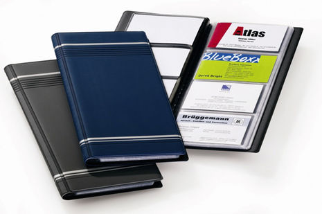 Vizitkár v prevedení matné PVC s dekoračnými prúžkami so zatavenými obalmi. Kapacita 96 vizitiek. Rozmery 118 × 250 mm.