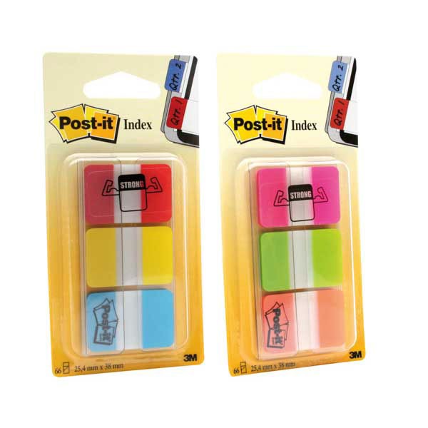 Plastové záložky s extra silnou priľnavosťou v klasických farbách. Prilepiteľné a popisovateľné perom, ceruzkou alebo popisovačom. Rozmery 25 x 43 mm, v balení 3 x 22 záložiek.