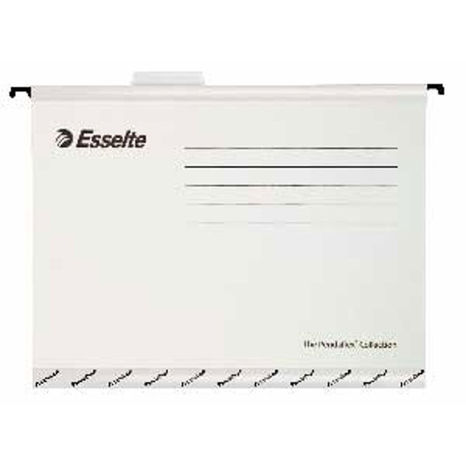 Závesné obaly Esselte Pendaflex kolekcie Standard vyrobené z pevného kartónu. Lisované dno obalu dovoľuje zvýšiť kapacitu na 30 mm. Súčasťou obalu je násuvný index z priehľadného plastu s výmenným papierovým štítkom. Formát A4, rozpätie vodiacich líšt 330 mm.